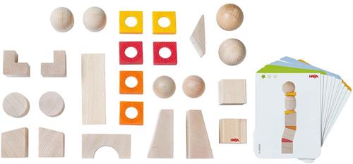 Met het HABA 3D compositiespel Balanceertorens kunnen kleine bouwers scheve torens, schuine bruggen en bogen maken volgens hun verbeelding of met behulp van de bijgevoegde sjabloonkaarten. Torens gemaakt van ballen zijn geen probleem meer, want kleurrijke wiggen geven de ballen ondersteuning. Dit bijzondere 3D legspel bestaat uit 19 stenen, 6 siliconen wiggen en 10 sjabloonkaarten.