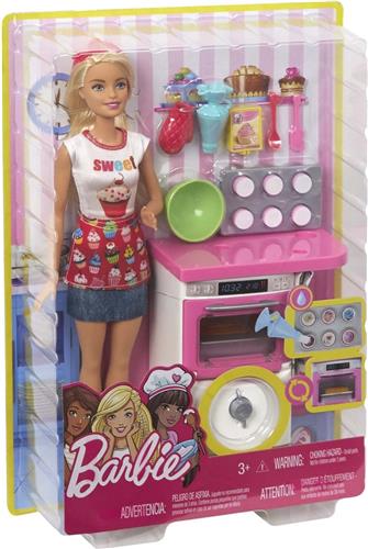 Met de Barbie Cupcake speelset kunnen kinderen vanaf 3 jaar urenlang plezier hebben. Deze kleurrijke speelset bevat een Barbiepop met een bakkersoutfit, een ovenhandschoen, twee bakvormen (één voor grote cakejes en één voor cupcakes), een oven die rinkelende geluiden maakt en verschillende bakaccessoires. De verpakking heeft een gewicht van 0.47 kg en is wasbaar, waardoor het schoonmaken eenvoudig is. Deze set stimuleert creativiteit en rollenspel, perfect voor kinderen die dol zijn op bakken en spelen met Barbie.