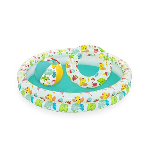 Eindeloos zomerplezier is gegarandeerd met de Bestway Zwembad set met Zwemband en Strandbal. Deze vrolijke set biedt niet alleen een opblaasbaar zwembadje, maar ook een praktische zwemband en een kleurrijke strandbal met matchende zomerprint. Ideaal voor jonge kinderen die dol zijn op waterpret, kan dit leuke zwembadje gemakkelijk in de tuin worden opgezet voor uren speelplezier.