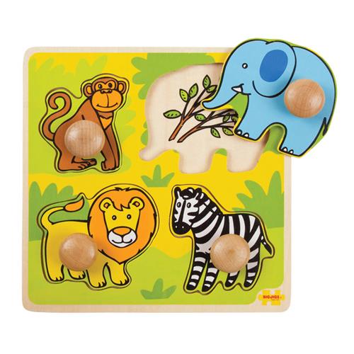 Laagste prijs € 11,99 voor Bigjigs houten knoppuzzel Safari - 4 stukjes is gemeten op 23-01-2025.