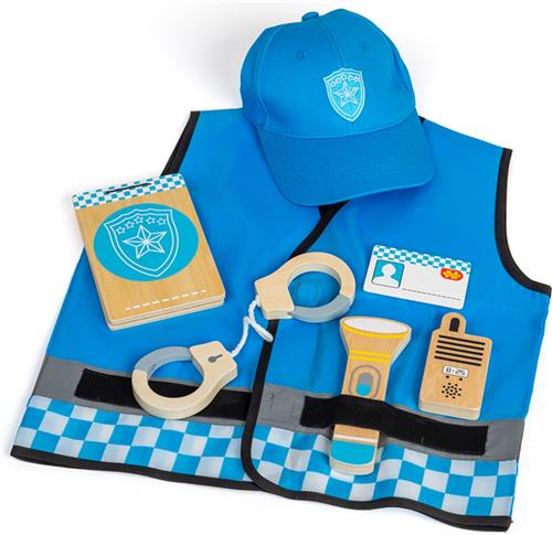 De set bevat niet alleen een politievest en hoed, maar ook een houten walkie talkie, ID-badge, ID-portefeuille, zaklamp en handboeien. Dit zorgt voor een realistische speelervaring waar kinderen van 3 tot 5 jaar eindeloos plezier aan beleven. De afmetingen van het jasje zijn 40,5 cm breed en 44 cm hoog, terwijl de verstelbare hoed een maat heeft van 48 cm tot 57 cm, waardoor deze perfect past bij de meeste kinderen in deze leeftijdsgroep.