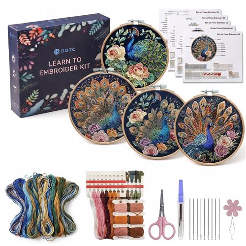 BOTC Pauw bloemen borduurpakket - Peacock Color Stamped Borduurpakket van 4 - Hobby en Creatief - Borduren