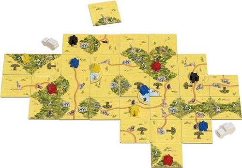 | Verpakkingsinhoud | Inhoud: 72 landtegels 50 dierfiches 1 starttegel 1 scoretableau 5 scorefiches 30 kleine houten meeples 5 houten olifanten 2 houten rangervoertuigen de spelregels |