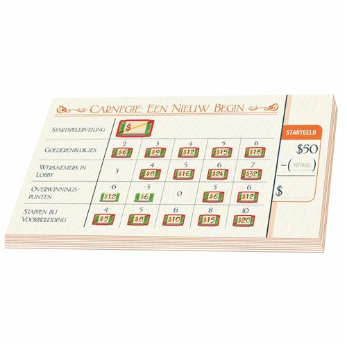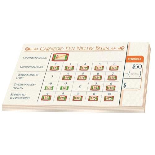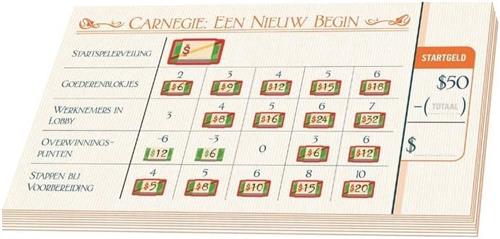 Met Carnegie Nieuw Begin - Uitbreiding - Nederlandstalige uitgave voeg je nieuwe elementen toe aan het basisspel, zoals nieuwe gift mogelijkheden, nieuwe afdelingen en optionele regels. Met deze uitbreiding wordt bepaald hoe elke speler het spel begint. Het spel heeft een speelduur van 120 minuten en valt onder de categorie strategische spellen. Zowel het spel als de handleiding zijn in het Nederlands.