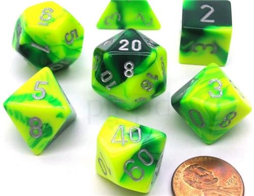 - Bij Spelhuis kun je Chessex Gemini Green-Yellow/silver Polydice Dobbelsteen Set (7 stuks) kopen voor de prijs van € 11,99. Dit is vandaag de goedkoopste webshop.