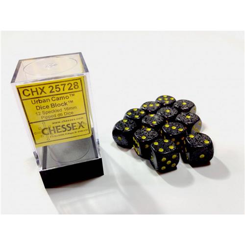 - Bij Bol.com kun je Chessex Urban Camo Speckled D6 16mm Dobbelsteen Set (12 stuks) kopen voor de prijs van € 23,94. Dit is vandaag de goedkoopste webshop.