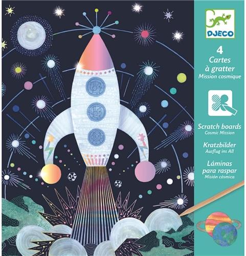 DJECO Cosmic Mission is een interactieve en educatieve ruimtevaart set voor kinderen vanaf 6 jaar. Met een formaat van 22 x 23 cm is deze houten set perfect voor jongens en meisjes die geïnteresseerd zijn in sterren, planeten, raketten en astronauten. Met behulp van het meegeleverde houten pennetje kunnen kinderen op 4 verschillende krasplaten prachtige afbeeldingen tevoorschijn toveren.