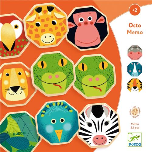 Houten dieren memory spel Octo van DJECO, met achthoekig speelstukken vandaar de naam octo. De grote speelstukken met dieren zijn geschikt voor kinderen vanaf 2 jaar. Draai memory kaarten om en verzamel zoveel mogelijk dierenparen, een leuk spel voor 2 om samen met je kind te spelen. Memory Octo zit verpakt in een stevige bewaardoos, hierin berg je dit spel makkelijk op. 32 memorykaarten Aantal spelers: 2-4 Spelduur: 10 minuten Leeftijd: 2 jr+