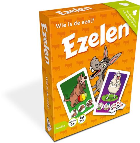 Ezelen, het vrolijke kaartspel dat iedereen kent, nu in een nieuwe uitvoering. Met grappige dierenkaarten en echte ezels. Ezelen is een gezellig, hectisch en snel spel voor de hele familie. Schuif de kaarten naar elkaar, verzamel vier dezelfde en pak als eerste een ezel. Te laat? Dan word je de ezel! Met een speeltijd van 15 minuten is dit denkspel geschikt voor kinderen en volwassenen vanaf 6 jaar tot 99 jaar. De verpakking bevat 20 dierenkaarten, 17 ezelkaarten en 4 ezelpionnen, waardoor het spel extra spannend en interactief wordt.