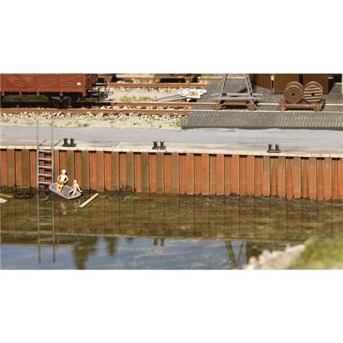 De kademuur is gedetailleerd en realistisch, met damwanden die zijn afgedekt met een betonplaat en verschillende bolders om schepen aan vast te maken. Dit maakt het ideaal voor het creëren van binnenhavens en zeehavens op een modeltreinbaan of diorama.