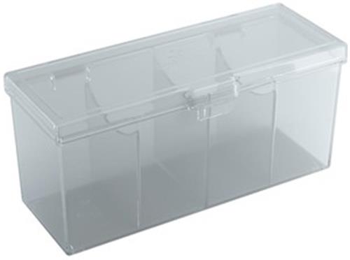 De Gamegenic Fourtress 320+ Clear is een transparante opbergbox waarin je volledige decks, dobbelstenen, tokens en 320 kaarten met dubbele sleeves kunt opbergen. Of het nu gaat om volledige decks, dobbelstenen, tokens of 320 kaarten met dubbele sleeves: er is veel dat de FOURtress kan bevatten en beschermen! Deze stevige doos is verkrijgbaar in 5 verschillende halftransparante kleuren, waardoor de inhoud gemakkelijk te identificeren is. De geïntegreerde vergrendeling houdt hem veilig gesloten, terwijl twee binnenwanden kunnen worden verwijderd om grotere compartimenten te creëren. De dozen zijn stapelbaar, dus ze zijn zowel perfecte reisgenoten als een geweldige opslagoplossing thuis.