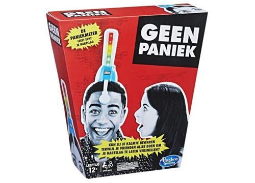 Geen Paniek is een actiespel dat geïnspireerd is op de populaire internet-uitdagingen met miljoenen views. Test of jij onder druk het hoofd koel kunt houden. Zet de hartslagmeter op je hoofd en laat de tegenspeler(s) met de dobbelsteen rollen om te bepalen hoe hij jouw koelbloedigheid gaat testen. De tegenspeler kan bijvoorbeeld de opdracht krijgen om heel dicht bij te komen en aan je te snuffelen of naar je te knorren. Als je hierop reageert, door bijvoorbeeld te lachen of terug te deinzen, kan je hartslag omhooggaan en de meter oplopen. Je denkt misschien dat jij je reacties wel zult weten te verbergen, maar de hartslagmeter laat precies zien wat je van binnen voelt! Als de meter te hoog oploopt, kleuren de lampjes rood, gaat het alarm af en heeft de tegenspeler de ronde gewonnen door jouw hoofd op hol te brengen.