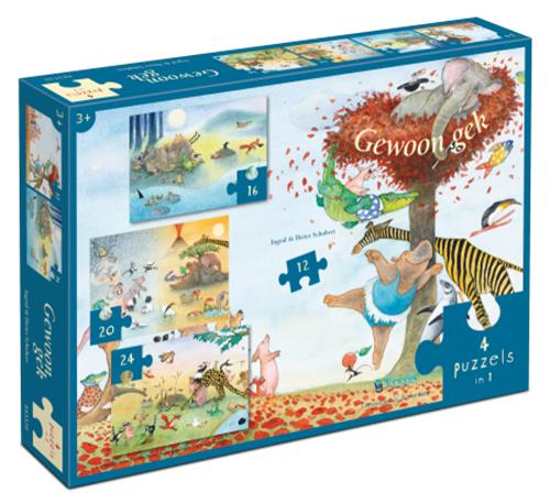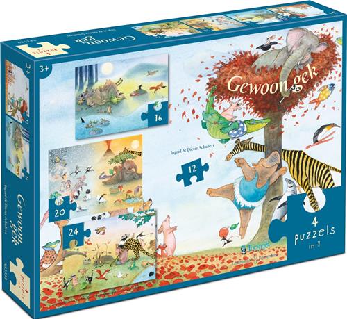 Gewoon Gek van Ingrid en Dieter Schubert is een prachtige puzzelset voor kinderen vanaf 3 jaar. Deze puzzelset is geschikt voor zowel jongens als meisjes. De verpakking bevat in totaal 72 puzzelstukjes, verdeeld over vier verschillende thema's: Gewoon/Gek (12 stukjes), Slapen/Wakker (16 stukjes), Koud/Warm (20 stukjes) en Stout/Lief (24 stukjes). De puzzelstukjes hebben vrolijke kleuren en zijn gemaakt van stevig karton, waardoor ze lang meegaan.