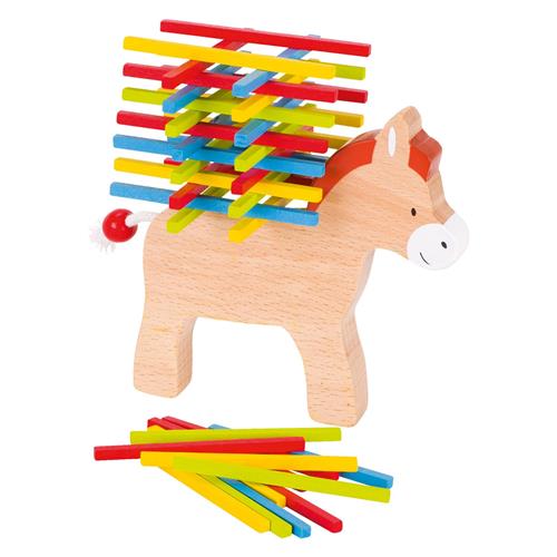 Bouw een zo hoog mogelijke toren bovenop deze trouwe pakezel! Hoe hoger de stapel, hoe gevaarlijker het wordt! Leg jij het laatste stokje neer? Inhoud: 1 houten pakezel en 60 houten balans-stokjes. Geschikt voor kinderen vanaf 5 jaar.