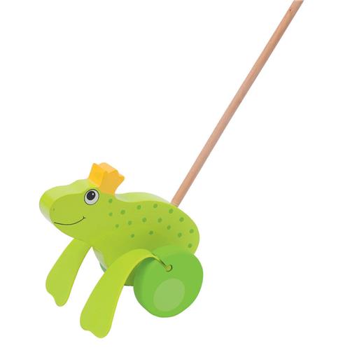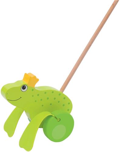 Laat je kleintje avonturen beleven met het Goki Duwfiguur Kikker Koning! Dit houten duwfiguur is vormgegeven als Kikker de Koning en zal de fantasie van je kind stimuleren. Als je het figuur voor je uit duwt, zul je zien dat de poten van de kikker vrolijk op en neer bewegen. Met een stoklengte van 60 cm is dit speelgoed perfect voor kleintjes die net beginnen met lopen.