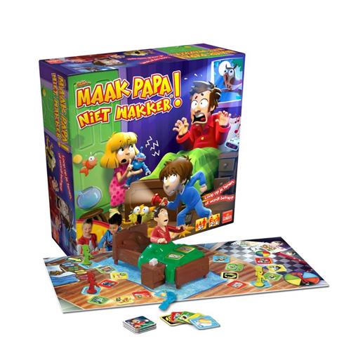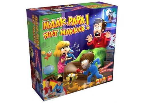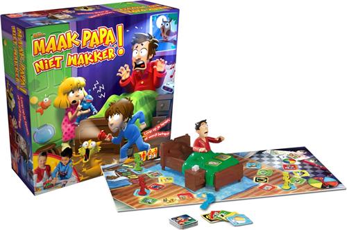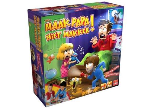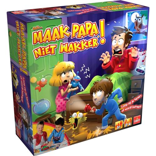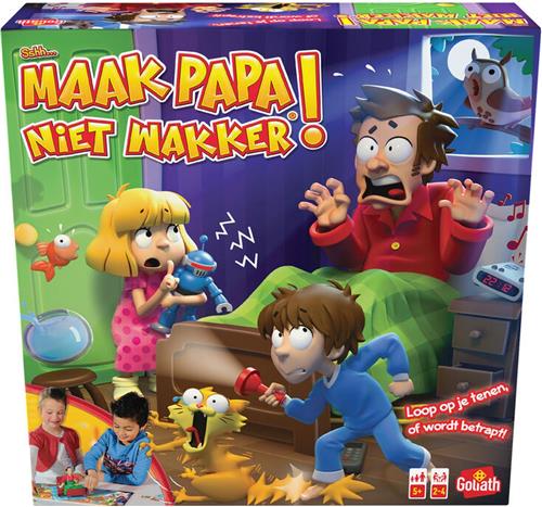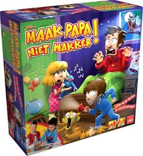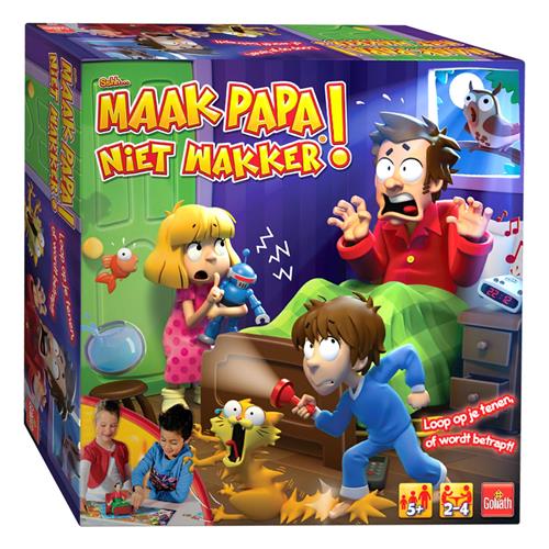 Goliath Sshh.. Maak papa niet wakker is een spannend familiespel waarbij het doel is om als eerste bij de koelkast te komen zonder papa wakker te maken. Iedere speler kiest een kleur figuur en krijgt kaartjes met gebeurtenissen die papa wakker zouden kunnen maken. Als je op een vakje belandt zonder beschermkaart, moet je op de knop drukken. Pas op, word je betrapt door papa, dan moet je terug naar bed! De speler die als eerste bij de koelkast aankomt, is de winnaar.