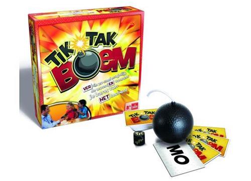 Het spel Tik Tak Boem is een zenuwslopend woordspel. Verzin zoveel mogelijk woorden voordat de bom afgaat. Gaat de bom bij jou af, dan ontvang je één strafpunt. Het spel Tik Tak Boem is een zenuwslopend woordspel waarbij je zo snel mogelijk woorden moet vinden met een opgelegde lettergreep. Probeer de bom door te geven voordat deze in jouw handen ontploft. Het spel is geschikt voor kinderen vanaf 8 jaar en kan gespeeld worden door 2-12 spelers.