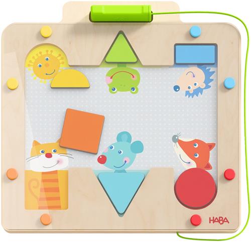 Ontdek de spannende wereld van het Haba Magneetspel Vario Vormen! Dit leerzame denkspel is perfect voor kinderen vanaf 2 jaar en stimuleert hun creativiteit en probleemoplossend vermogen. De dieren hebben de hulp van de kinderen nodig om hun lichaam te vinden, en met de magneetpen kunnen kinderen de kleurrijke geometrische motieftegels eenvoudig naar de juiste positie verplaatsen en zelfs draaien in 360°.