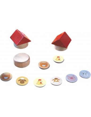 Inhoud: 18 dierplaatjes (3 x haan, hond, kat, koe, schaap, varken), 3 huizen, 2 daken, spelregels