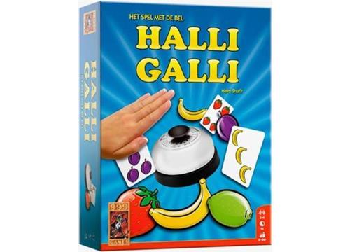 Spectaculair reactiespel. Wie tot 5 kan tellen, kan meedoen Iedere speler krijgt een gedekte stapel kaarten. Op elke kaart staan één of meer vruchten. Om beurten draait iedere speler een kaart om en legt deze op zijn eventueel eerder omgedraaide kaarten. Zo is voor iedere speler altijd maar één kaart zichtbaar. Als van een bepaalde vrucht precies 5 exemplaren zichtbaar zijn, proberen alle spelers zo snel mogelijk op de bel te drukken. Wie dat als eerste doet, krijgt alle open kaarten. Wie geen kaarten meer heeft, is uitgeschakeld. Wie blijft als laatste over? Halli Galli is niet alleen leerzaam voor jonge kinderen, maar ook uitstekend vermaak voor studenten of families die gewoon even een eenvoudig, gezellig spelletje tussendoor willen spelen.