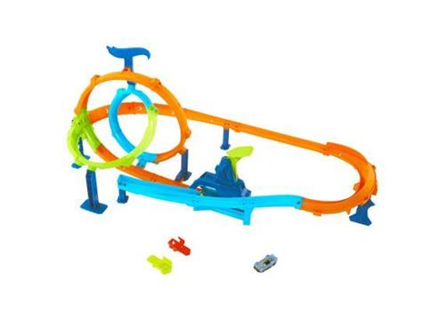 Beleef de adrenaline van de racetrack met de Hot Wheels Stunt Tracks Rapid Launch & Crash. Lanceer je Hot Wheels speelgoedauto's via doubles loopings en stort je in twee spannende crashzones. Dit dynamische baanset zorgt ervoor dat kinderen de ultieme stuntuitdaging aangaan, terwijl ze hun snelheid testen in een race tegen twee dubbele loopings. De 180 graden bocht brengt de voertuigen terug naar het beginpunt voor een nieuwe ronde van stunts.
