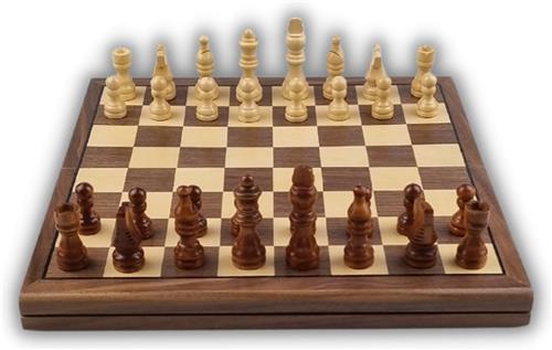 Dit houten schaakbord is zeer degelijk en gemakkelijk op te bergen, waardoor het ideaal is om mee te nemen op reis. Het bord is inklapbaar en de schaakstukken worden veilig bewaard onder een elastieken band. Met afmetingen van 30x30 cm biedt dit bord voldoende speelruimte voor urenlang schaakplezier.