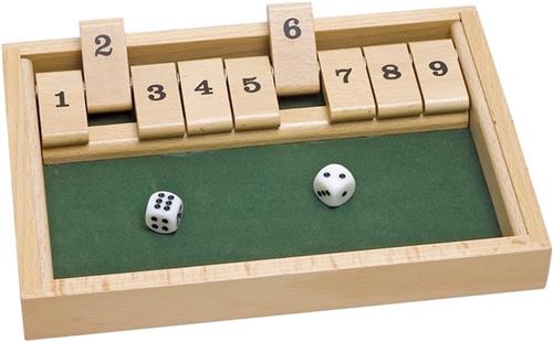 Shut the Box is een vermakelijk dobbel- en kansspel dat gespeeld kan worden door 2 of meer spelers. Het doel van het spel is om zoveel mogelijk of alle cijfers op het speelveld dicht te klappen. De speler die erin slaagt om alle cijfers om te draaien, mag zich de winnaar noemen! Als geen enkel cijfer dichtgeklapt wordt, worden deze punten bij elkaar opgeteld en wint de speler met de minste punten.
