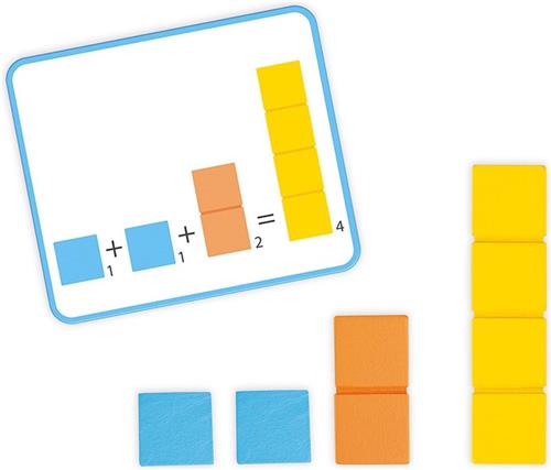 Een educatief spel om te leren tellen en op een leuke manier een uitblinker in wiskunde te worden! Met 12 modellen en 14 balkjes met schaalverdeling in verschillende kleuren en groottes, kan het kind op 2 verschillende manieren spelen. Voor beginners betekent dit de balkjes op de juiste plaats op het bord aanbrengen om tot 5 te leren tellen of om de verschillende manieren om te tellen via het volgen van het model visueel weer te geven. Voor de meer ervaren spelers is het mogelijk om zijn eerste sommen buiten het bord te maken door het model te volgen. Bijvoorbeeld, hoeveel is een oranje balkje plus een rood balkje? Het antwoord is een groen balkje. Het handige bord is voorzien van silicone antislipvoeten voor meer stabiliteit. Dit product is ideaal om ontdekken en experimenteren te ontwikkelen, evenals het leren tellen. De stukken zijn geverfd met waterverf, wat zorgt voor een veilige en kleurrijke speelervaring.