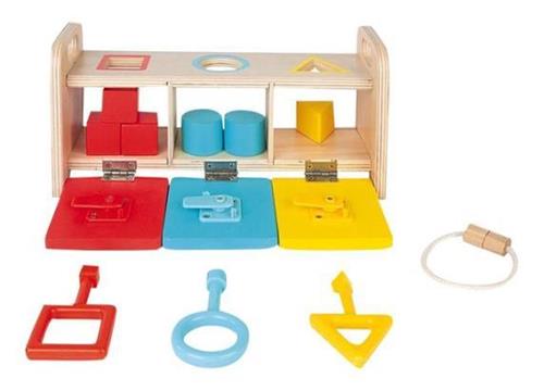 Deze sleuteldoos is ideaal om de behendigheid van uw kind al spelenderwijs te ontwikkelen. Om de deurtjes te openen en de onderdelen in de doos terug te krijgen, moet de juiste sleutel voor het overeenstemmende slot worden gekozen. De achterkant van de doos is handig aangezien deze transparant is om de onderdelen te zien vallen en geeft het aantal en soort te plaatsen blokjes aan. De magnetische sleutelbos haakt praktisch vast aan het handvat om het verlies van sleutels te vermijden. Geleverd met 6 blokken (1 gele driehoek, 2 blauwe cirkels, 3 rode vierkanten) en 3 plastic sleutels. Stukken met waterverf geverfd. Dit product ontwikkelt hand-en-oogcoördinatie en oorzakelijk verband.