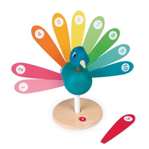 De houten pauw van JANOD uit de 'Ik Leer' serie is een spel voor peuters en kleuters. Draai aan de voet en ontdek welk cijfer tevoorschijn komt. Probeer vervolgens de veer met het overeenkomstige cijfer, kleur of aantal stippen te vinden en trek deze veer eruit. Dit educatieve spel kan op 3 verschillende niveaus gespeeld worden: op basis van kleur, aantal stippen of cijfers. Op deze manier leren kinderen op speelse wijze over kleuren, cijfers en tellen. De pauw heeft afmetingen van 11 x 17 cm en is geschikt voor peuters vanaf 2 jaar.