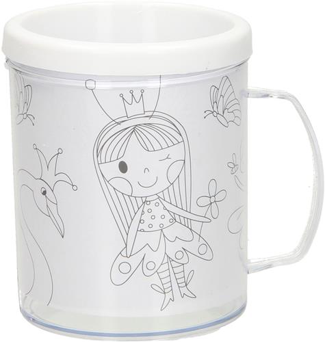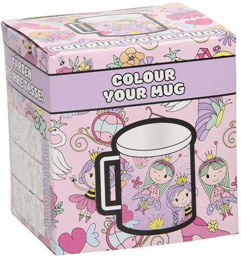 Kleur je eigen kunststof mok met deze complete set, speciaal voor de kleine prinsesjes. De dubbelwandige mok bevat een uniek ontwerp waar je zelf kleur aan kunt geven. Met 3 verschillende kleurplaten die je naar hartenlust kunt verwisselen, is deze mok een ware creatieve uitdaging voor jonge meisjes. Let op: kleurpotloden en krijtjes zijn niet inbegrepen.