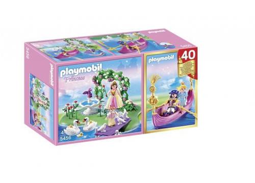 De koningin wordt door de lijfwacht in een roze gondel naar het eiland gebracht. Op het romantische eiland staat de prinses met haar dochterje ongeduldig te wachten tot de koningin aankomt. Het kleine meisje staat op de steiger de zwanen en vogels te voeren. PLAYMOBIL viert zijn 40ste verjaardag en ontwikkelde deze speciale jubileumset. De koningin maakt een tochtje in de gondel met de prins. Op het eiland staan de prinsessen al vol ongeduld te wachten.