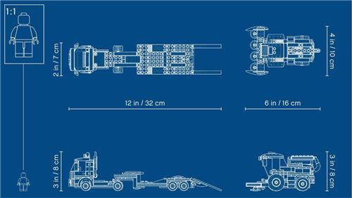 De LEGO City Maaidorser Transport met oplegger is ca. 8 cm hoog, 31 cm lang en 7 cm breed. De maaidorser is ca. 8 cm hoog, 17 cm lang en 10 cm breed.