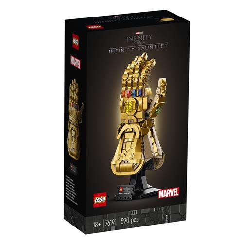 De prachtige LEGO® Marvel Infinity Gauntlet (76191) weerspiegelt de betoverende stijl van de Marvel Studios films Avengers: Infinity War en Avengers: Endgame. Deze authentieke goudkleurige versie van LEGO® stenen van de beroemde Infinity Gauntlet bevat kleurrijke Infinity Stones en een stevige standaard met een informatiebordje. Met dit 590-delige model kunnen volwassen Marvel fans zich helemaal onderdompelen in het creatieve bouwproces waarin ze een van de meest herkenbare en verwoestende wapens uit de comicgeschiedenis namaken. Dit opvallende bouw- en displaymodel is een geweldig cadeau voor een verjaardag, de feestdagen of een andere gelegenheid voor elke modelbouwer of volwassen fan van het Marvel Universum. Dit fascinerende model is ca. 31 cm hoog, 13 cm breed en 11 cm diep en vormt een aantrekkelijke gespreksstarter, of je het nu bij je thuis of op kantoor neerzet. Een indrukwekkend eerbetoon aan de Marvel films, dat een boeiende bouwervaring biedt. Wanneer je dit tijdloze displaymodel af hebt, zal het zeker bewonderende blikken trekken. Dankzij de hoogwaardige, eenvoudig te volgen instructies kun je direct aan de slag met dit fascinerende bouwproject zodra je de doos opent. Alle sets uit de LEGO® collectie voor volwassenen bieden een boeiende bouw- en displayervaring waar elke modelbouwer blij van wordt. LEGO® bouwsets voldoen aan strikte kwaliteitsnormen, waardoor ze consistent, compatibel en comfortabel in elkaar te zetten en uit elkaar te halen zijn dat is al zo sinds 1958. LEGO® onderdelen worden gegooid, verhit, geplet, gedraaid en geanalyseerd om er zeker van te zijn dat ze voldoen aan strenge wereldwijde veiligheidsnormen.