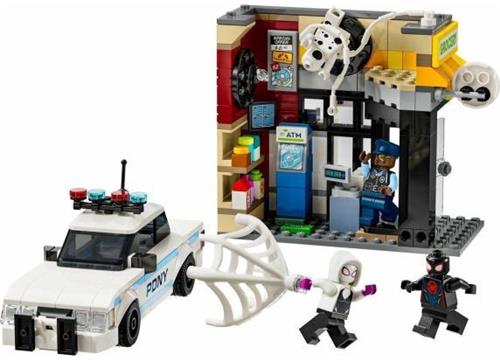 De set bevat 4 minifiguren: Miles Morales, de Spot, Gwen Stacy en agent Jefferson, elk met hun eigen kenmerkende details. Bouwers kunnen de supermarkt muur met explosiefunctie activeren om de geldautomaat te beroven, terwijl de politieauto met gemak 2 minifiguren kan vervoeren. Daarnaast zijn er accessoires zoals een lang flexibel webtouw en een web om minifiguren mee te vangen, wat zorgt voor eindeloos speelplezier.