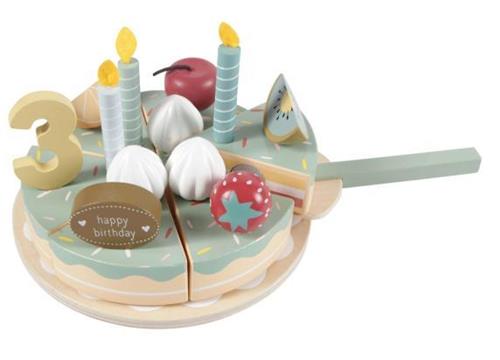 De verjaardagstaart is gemaakt van hout en heeft een vrolijke groene kleur. Dit duurzame materiaal zorgt ervoor dat kinderen veilig kunnen spelen en de taart gemakkelijk kunnen schoonmaken na het spelen. Met de realistische details en kleurrijke versieringen zullen kinderen urenlang genieten van dit speelgoed.
