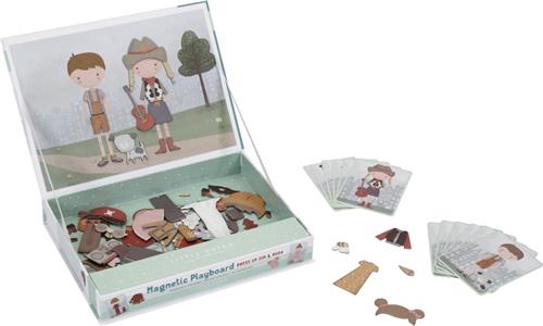 Met het Little Dutch Jim & Rosa Magnetisch Speelbord kan je de outfit die op het kaartje staat namaken met de magnetische kleding op het bord. Je kindje kan eindeloos combinaties maken waardoor je kindje zichzelf urenlang kan vermaken. Deze magnetische puzzel bestaat uit 80 kleine magneten en 6 kaarten voor Rosa en 6 voor Jim. De doos is gemaakt van stevig karton om alle stukjes makkelijk op te bergen. De magnetische deksel kan gebruikt worden als speelbord. Het speelbord is geschikt voor kinderen vanaf 3 jaar.