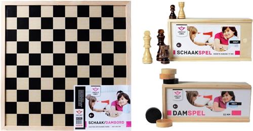 De set bevat houten damstenen in een handige kist, met in totaal 20 zwarte en 20 witte damstenen. Daarnaast bevat de set ook een houten schaakspel met 16 witte en 16 zwarte schaakstukken. De schaakstukken zijn voorzien van vilt aan de onderzijde, wat zorgt voor een soepele beweging op het bord.
