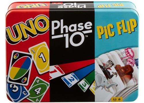 Speel het klassieke UNO, Phase 10 en Pic Flip met dit mooie UNO verzamelblik! Je ontvangt drie verschillende kaartspellen die je tegelijkertijd eenvoudig weer kunt opbergen. Laat met Pic Flip zien hoe snel je bent! Pic Flip is een te gek, razendsnel kaartspel dat erg gemakkelijk is te begrijpen. Kijk snel welke van je kaarten bij de afbeelding passen en probeer zo allemaal kwijt te raken. Zodra je een passende kaart hebt gevonden, wordt onmiddellijk een andere afgeroepen en begint het zoeken opnieuw. Je moet dus snel denken, want de eerste speler die alle kaarten kwijt is wint.