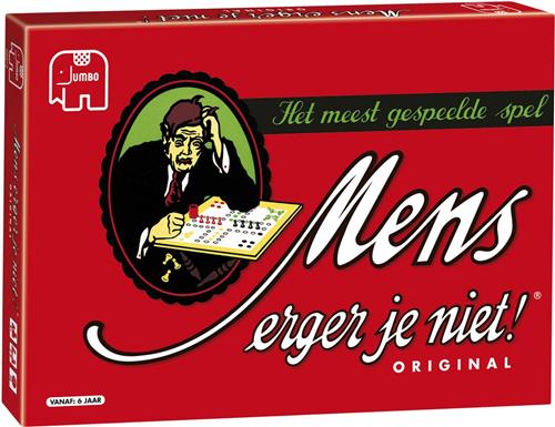 De originele uitvoering van dit meest gespeelde spel. Wie kent het niet? Dé manier om regenachtige zondagmiddagen door te komen, al is Mens Erger Je Niet eigenlijk altijd een vermakelijk spel. 2 tot 6 spelers, vanaf 6 jaar. Jumbo mens erger je niet is ongetwijfeld het meest bekende en gespeelde bordspel ooit. Dobbel naar de eindstreep en schakel je tegenstanders uit. Maar pas op, voor je het weet ben je zelf het haasje!