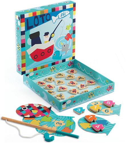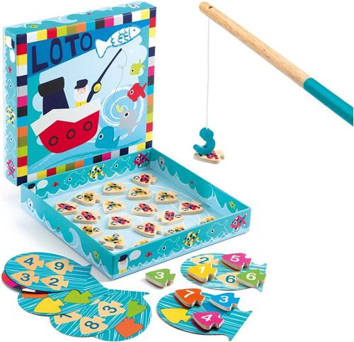 Educatief lotto spel van Djeco waarbij de spelers hengelen naar de genummerde vissen met een magnetische hengel. De eerst die zijn bord vol heeft, heeft gewonnen! Inhoud: 3 kaarten met nummers, 3 kartonnen kaarten met kleuren, houten visjes en een houten hengel. Gemaakt van hout en karton. Geschikt voor kinderen vanaf 3 jaar.