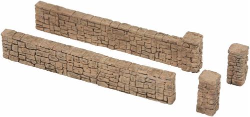 De muur heeft een totale lengte van 71 cm en een hoogte van 1,5 cm, met pijlers van 1,9 cm hoog. Voor de montage van de muur wordt aangeraden om een kleine zaag en kunststof lijm of hete lijm te gebruiken. Als u de muur wilt kleuren, zijn de NOCH detailmarkers of patina-poeder uitstekend geschikt voor een realistisch effect.