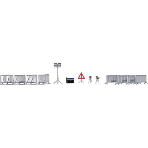 De set bevat een scala aan hoogwaardige toebehoren zoals 4 lichtgewicht barrières, 4 afzethekken, een schijnwerper, een stroomgenerator, 2 flitsers en verkeersborden. Deze elementen zijn essentieel voor het vormgeven van een authentiek tafereel en dragen bij aan de sfeer van uw modelbaan. Of het nu gaat om een politieactie of een controlepost, de detailrijkdom van deze set maakt uw modelwereld compleet.