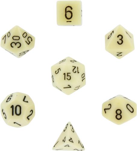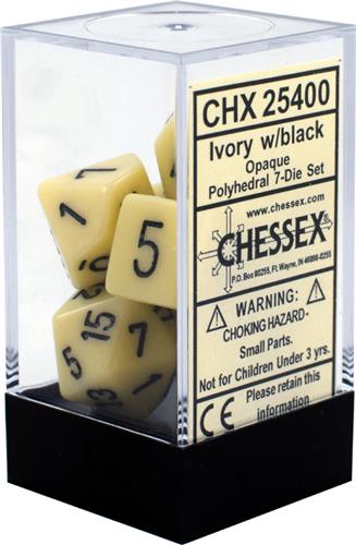 Een set van zeven dobbelstenen, effen ivoorkleurig met zwarte cijfers. Deze set bevat een elk van de volgende: 4-zijdig, 6-zijdig, 8-zijdig, 10 zijdig (0-9), 10-zijdig (00-90), 12-zijdig en 20-zijdig. De dobbelstenen zijn gemaakt van kunststof en hebben een gewicht van 35 g. Ze zijn ivoorkleurig met zwarte cijfers bedrukt. De CE-markering is zichtbaar op de dobbelstenen. Het aantal vlakken op de dobbelstenen is 20. Het personage is niet van toepassing op deze dobbelstenen.