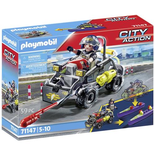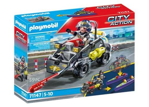 De 59-delige set bevat een transformeerbare quad met een kanon, dynamiet, speciale uitrustingen en een PLAYMOBIL figuur. De wielen kunnen worden vervangen door drijvers om de quad snel om te bouwen tot een speedboot. Daarnaast is de meegeleverde figuur veelzijdig door het verwisselbare gezicht.
