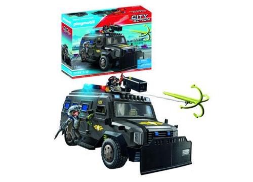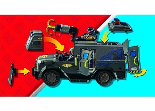 Moderne Tactical Unit terreinwagen met licht en geluid, twee PLAYMOBIL-figuren en talrijke accessoires voor spannende politieoperaties in de kinderkamer.