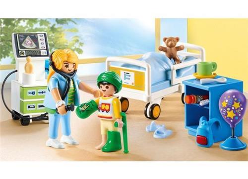 | Verpakkingsinhoud | De speelset bestaat uit een kinderziekenhuiskamer met twee PLAYMOBIL®-figuren, een ziekenhuisbed op wielen, een röntgenapparaat, een kast, twee stickervellen en vele andere extra's. De afbeeldingen en pleisters op de stickervellen kunnen worden hergebruikt. |
