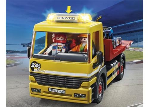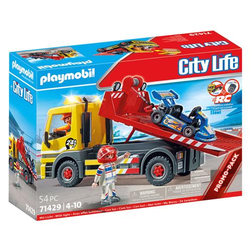 Een raceauto met pech langs de weg? Geen probleem voor de PLAYMOBIL Sleepdienst met zijn veelzijdige sleepwagen. De twee mannen springen meteen in de bestuurderscabine, zetten de knipperende lichten aan en rijden weg. Eenmaal aangekomen bij hun bestemming, verplaatsen ze de oprijplaat naar achteren en klappen deze uit. Met behulp van de lier takelen ze het voertuig op en duwen de oprijplaat terug. Nu gaat het naar de werkplaats. Een zeer gedetailleerde PLAYMOBIL speelset voor kinderen vanaf 4 jaar. Het knipperlicht is afneembaar (batterijen inbegrepen) en kan worden geactiveerd via een knop en schakelt automatisch uit na drie minuten. Voor het slepen van een motorfiets kan de speciale motorbevestiging met twee bevestigingen voor verschillende bandbreedtes worden gebruikt. Het voertuig is compatibel met RC en kan worden gecombineerd met zowel de 2,4 GHz RC-module set (6914) als de Bluetooth RC-module set (71397).