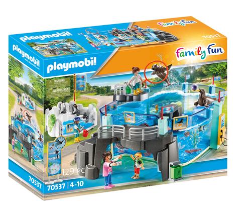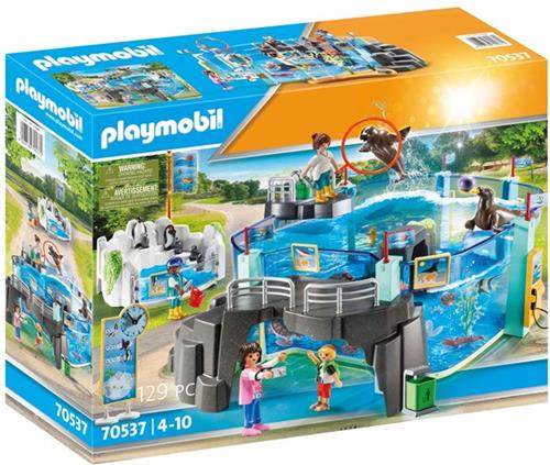 Kom naar de zeeleeuwen show in het Playmobil zee aquarium kijken! Het bezoekersterras, de diepzeegrot, de panoramavensters en een avonturenkoepel nodigen uit tot het bekijken van de zeeleeuwen en de onderwaterwereld. Of bekijk de pinguïns in hun bassin met glijbaan. Het grote waterbassin kan met water worden gevuld.