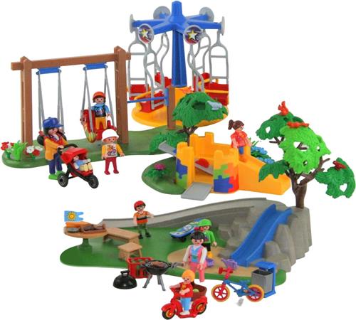De kinderen uit de buurt beleven een geweldige dag in de grote speeltuin. Heerlijk een dagje schommelen, glijden en rondjes draaien. Sommige kinderen gaan in de draaimolen of in de schommel, terwijl andere kinderen met hun skateboard van de helling gaan. Aan het einde van de middag wordt er heerlijk gebarbecued. Wat een heerlijke zomerdag. Ze kunnen er geen genoeg van krijgen. Deze 159 delige set van Playmobil bevat o.a. 2 landschapselementen met bomen, een skateboardhelling en een glijbaan, een schommel, een draaimolen, een klimtoestel met glijbaan voor de allerkleinste, 9 Playmobil poppetjes, een kinderwagen, een fiets, een step, een skateboard, 2 eekhoorntjes, 2 vogels, een vlinder, een tafel met bankje, een barbecue en nog veel meer gerelateerde accessoires. Zie de detailfoto’s voor de complete inhoud van de set. Deze grote speeltuin is door Playmobil in gelimiteerde oplage gefabriceerd!